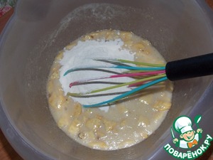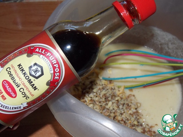 Влить соевый соус, добавить орехи и печенье, перемешать.