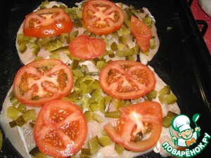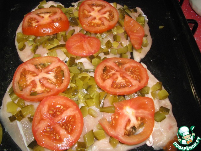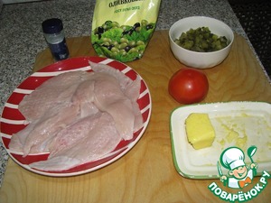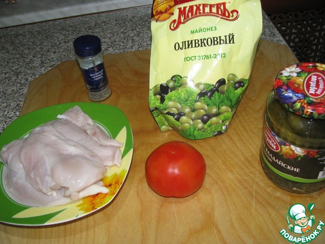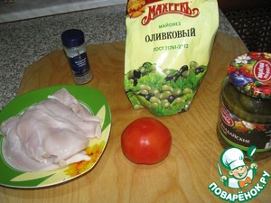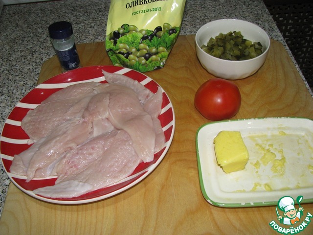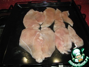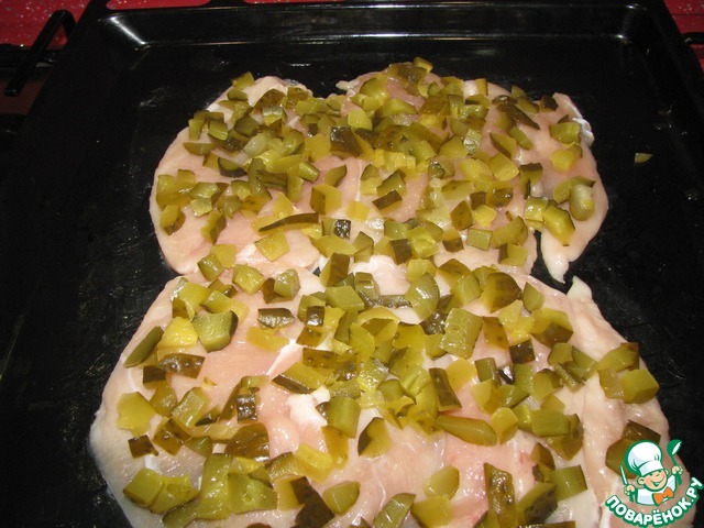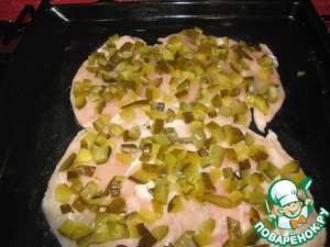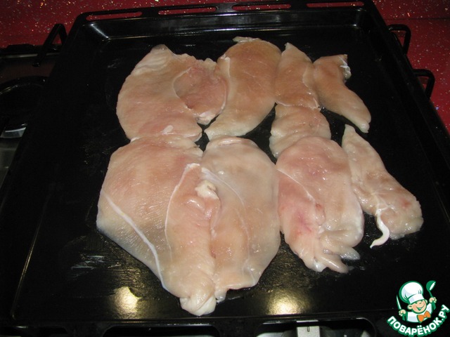 Грудку разрезать вдоль на 2 части, отбить. Слегка посолить, поскольку огурцы соленые