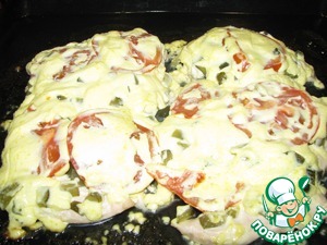 Смазать майонезом. Разогреть духовку до 200*, и запекать мясо 30-40 минут, выложить на блюдо