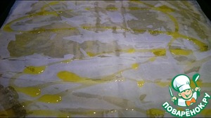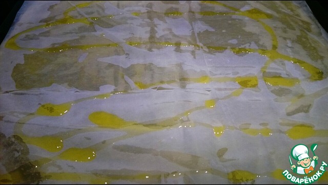 Лист фило смазываем растительным маслом с помощью кулинарной кисти, выкладываем на него еще три листа, каждый из которых также смазываем.