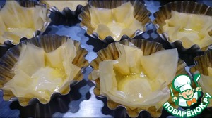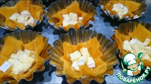 Далее духовку надо выключить, достать корзиночки, быстро заполнить предварительно нарезанным небольшими кубиками сыром и вернуть в еще горячую духовку, чтобы сыр немного расплавился.