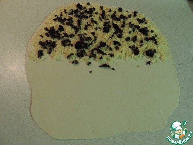 На смазанную яйцом половину теста выложить сыр, маслины и томаты