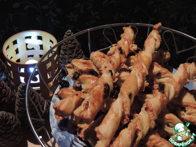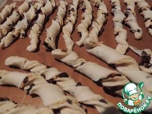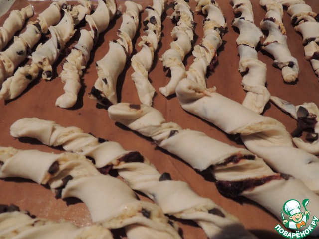 Нарезать получившееся тесто на полоски 2 см. и скрутить в спиральки. Выложить на противень и смазать оставшимся взбитым яйцом. Поставить в духовку на 200 градусов на 15-20 минут.
