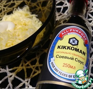 Сыр трем на мелкой терке, чеснок измельчаем, добавляем йогурт и соевый соус.