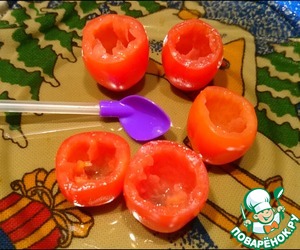 У черри срезаем верхушку, вынимаем содержимое, насколько это возможно. Нижнюю часть тоже слегка подрезаем, чтобы помидорка устойчиво стояла.