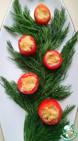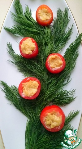 Выкладываем укроп в виде ветви ели, размещаем помидоры, наполняем сырной массой.