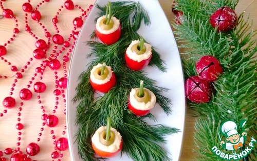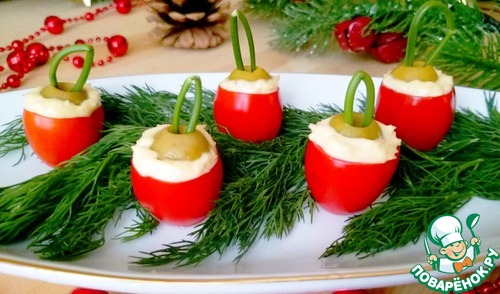 Любимые всеми помидоры с сыром и чесноком в виде небольших "елочных шаров" - на один укус. Отличный тематический вариант подачи закуски для новогоднего фуршета.