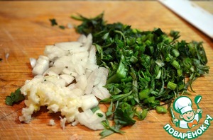 Всю зелень помыть, обсушить. Лук и чеснок почистить. Всё мелко нарезать.