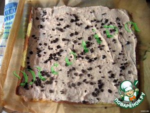 Сверху на крем высыпаем, порезанный небольшими кубиками, шоколад (так как корж еще очень теплый, то шоколад расплавится и замечательно смешается с творожной начинкой).