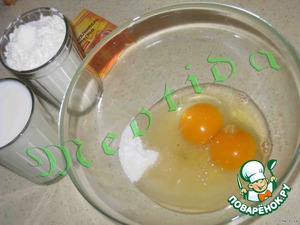 Сахар надо взбить с ванилином и яйцами в пышную воздушную массу, до увеличения в 2,5-3 раза в объеме, пока сахар не растворится (это нужно обязательно, чтобы тесто было легким и воздушным), с помощью миксера.