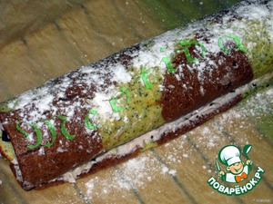 Заворачиваем рулетик, посыпаем сахарной пудрой и какао (хотя можно ничем не посыпать, он получается очень красивый и без посыпки, благодаря своей пятнистости).