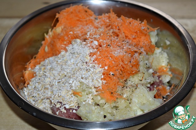 В фарш добавить овощи, овсяные хлопья (измельчить или использовать мелкие овсяные хлопья)