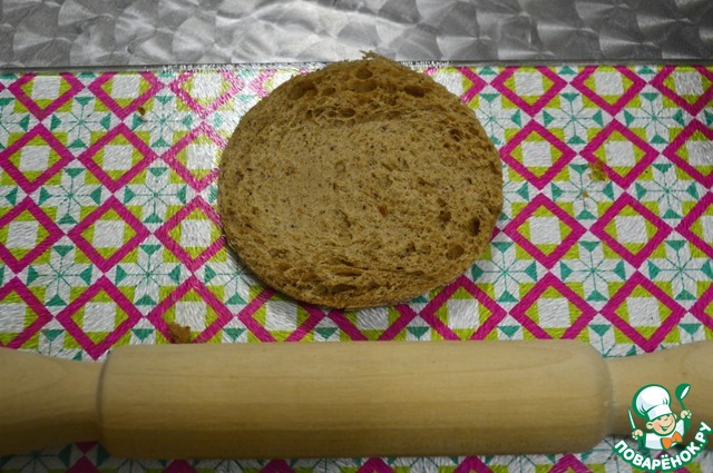 Формочкой, в которой будем жарить яйцо, вырезаем хлеб. Если кусочек хлеба немного меньше формочки, то его можно прокатать скалкой. Что я и сделала. Хлебушек обжариваем на сухой сковороде; если хотите - можете обжарить на масле.