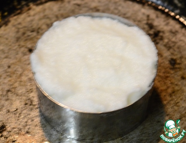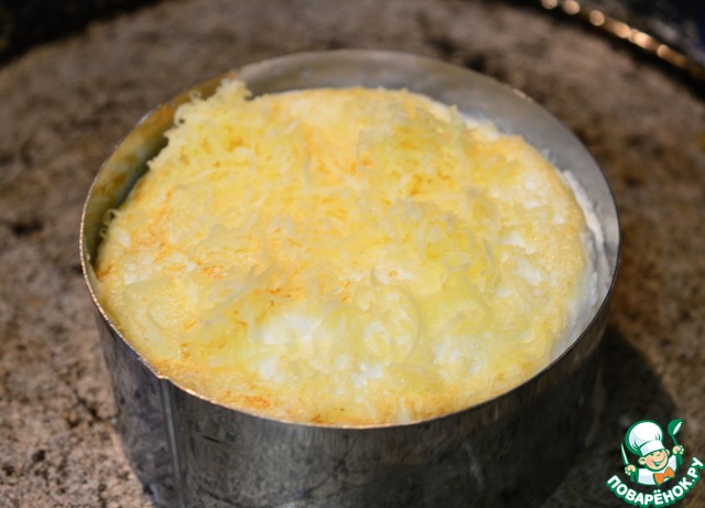 Говорим: чухры-пухры-мухры и переворачиваем формочку. Это удобно делать лопаткой. Сверху посыпаем сыром и закрываем крышкой. Ждём минутку и снимаем формочку со сковороды.