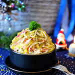 Квашеную капусту слегка отжать и добавить в салат. Измельченный укроп отправить туда же.