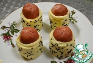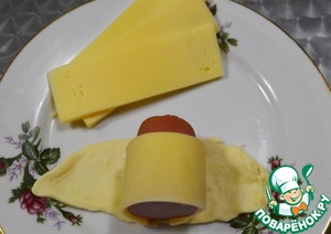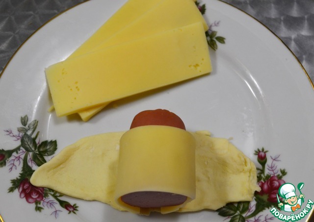Червертинку сосиски оборачиваем сначала сыром, затем полоской из теста.