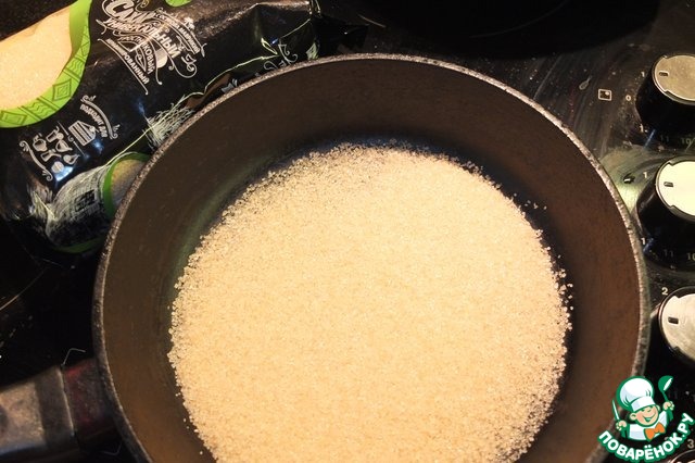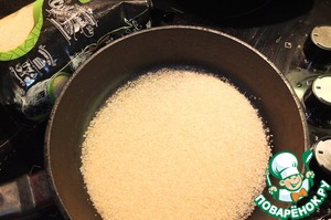 Для карамели на сковороду с толстым дном высыпаем сахар.