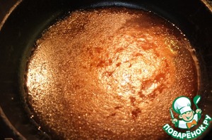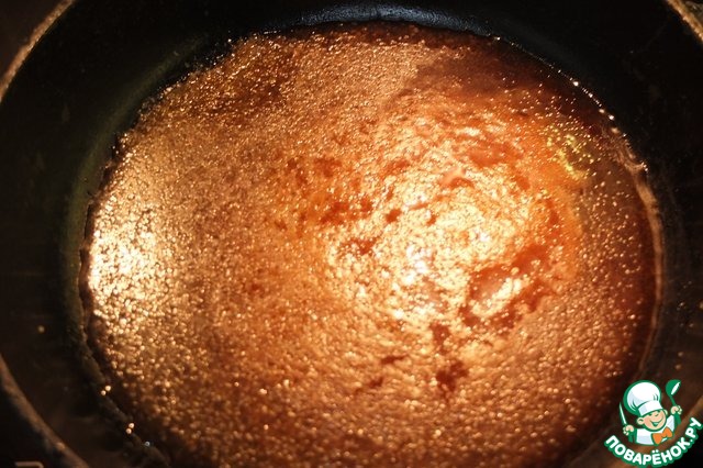 Нагреваем сахар на небольшом огне до полного растворения. Получится вот такая темная густая масса. Массу не перемешиваем, если сахар будет плавиться неравномерно, то наклоняйте сковороду, то в одну, то в другую сторону.