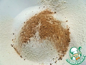 Муку просеиваем и смешиваем с содой и сахаром (в оригинале 110 г). Моя мука 1 сорта с небольшим вкраплением отрубей, люблю такую.