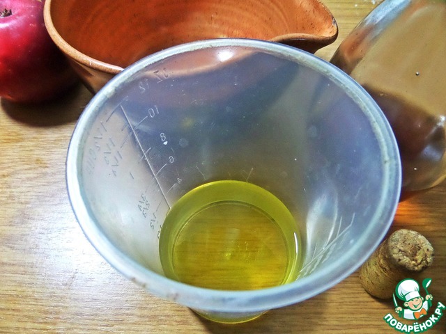 Отдельно отмеряем растительное (я беру всегда оливковое, с ним шелковистое тесто получается) и в него ложку яблочного уксуса добавим (у меня домашний).