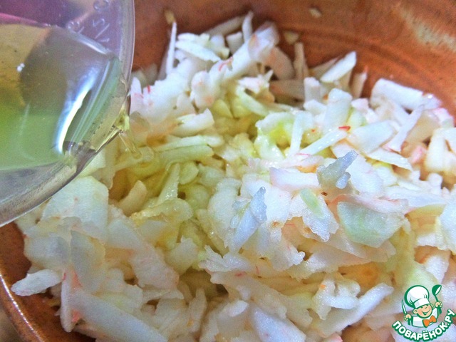 Вливаем отмеренное масло с уксусом в яблоки, смешиваем.
