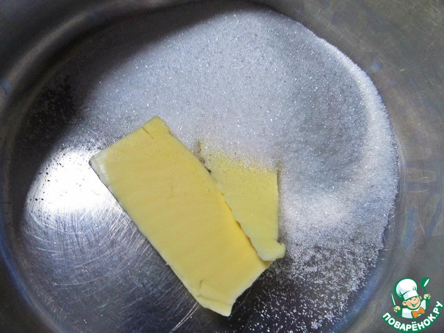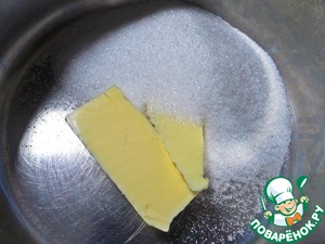 В это время готовим сахарную основу. Растопить сливочное масло, смешать на огне с сахаром (в оригинале 85 г). Тут очень важно, не проследить, когда сахар схватится в карамель. Я решила не рисковать, сахар мой растопился уже в духовке под ябюлочками.