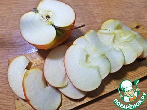 Более крупное яблоко не очищаем от кожицы, только от серединки и делим на дольки.