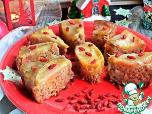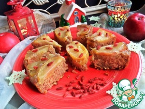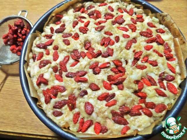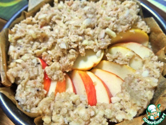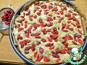 Если есть ягоды, лучше их положить на яблоки внизу, иначе могут подгореть. Тут у меня ягоды годжи-горсть. У Джейми добавлен грецкий орех в крошке.