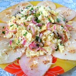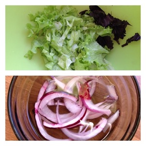 Листья базилика измельчить ножом. Листья салата порезать или нарвать руками. Лук нарезать полу кольцами и замариновать минут на 15 : в воду добавить сахар и уксус, опустить туда лук.