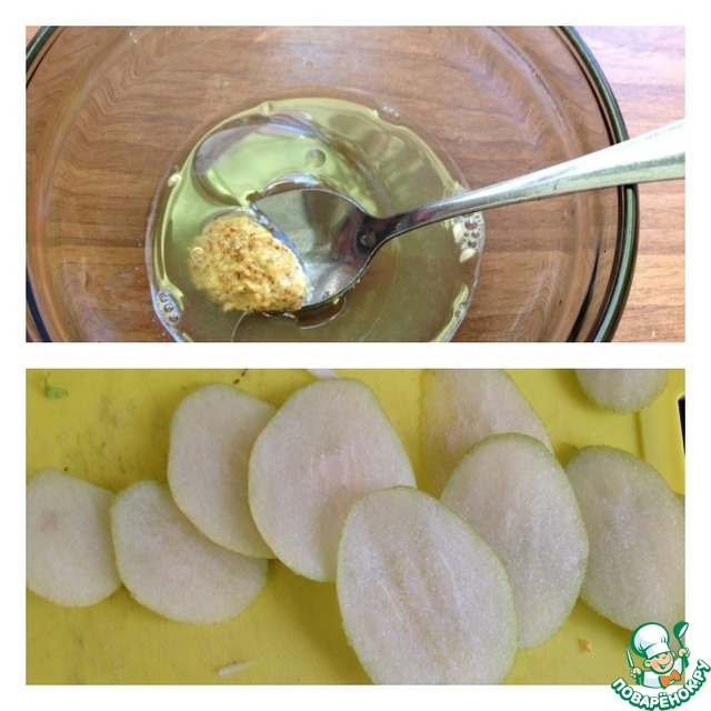 Из половины апельсина выдавить сок. Добавить горчицу и масло. Перемешать. Салатная заправка готова. Грушу промыть, от кожицы не чистить. Нарезать грушу тонкими слайсами.