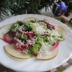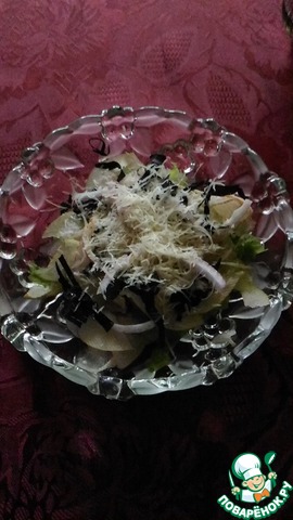 Следующую порцию я сделала немного по-другому. Я выложила салат, сверху лук, сверху слайсы груш. И припудрила их морской солью (свежепомолотой) (в таком варианте салат не раскиснет, а грушам будет хорошо), потом лук, базилик, и оба сыра.