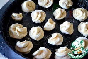 Смазываем противень и кладем цветочки на расстоянии друг от друга, они будут увеличиваться в размерах при выпекании.