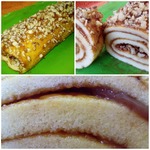 Смазать поверхность бисквита сгущенным молоком и сверху присыпать дробленым миндальным орехом. Свернуть в рулет и дать полностью остыть.