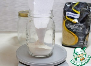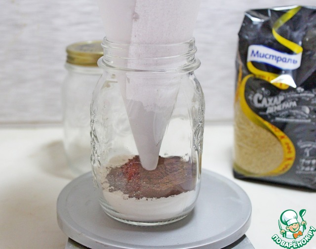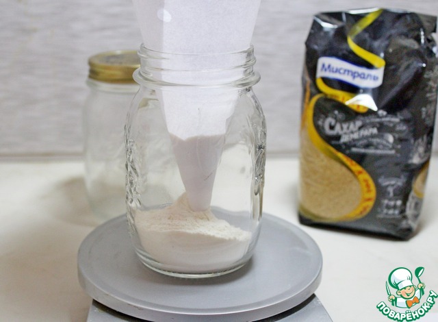 При помощи бумажной воронки всыпать 50 гр просеянной муки с солью и разрыхлителем.