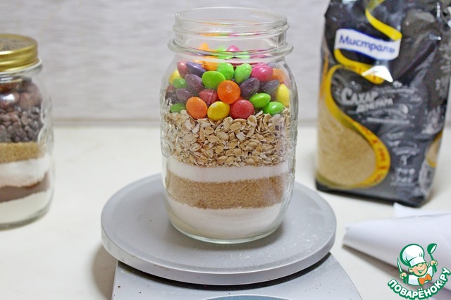 Для овсяного печенья в баночку всыпать 50 гр муки с солью и разрыхлителем, 100 гр сахара "Демерара Мистраль", 100 гр овсяных хлопьев и драже M&M`.