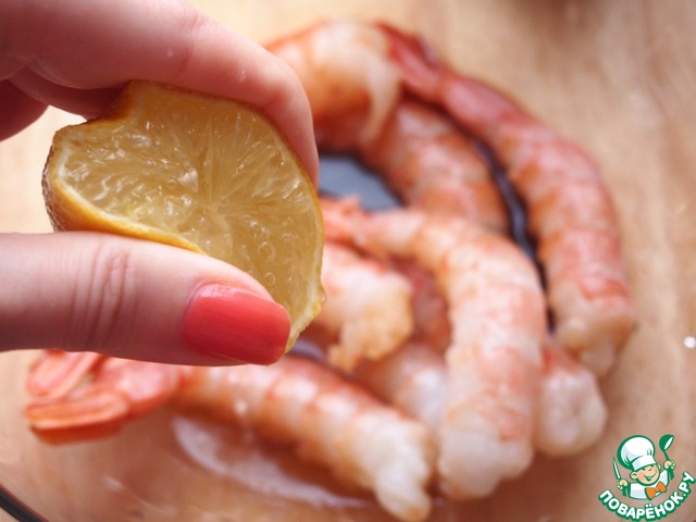 Креветки при необходимости разморозить, почистить, оставив хвостики.