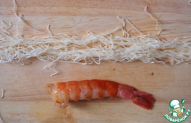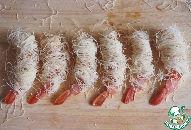 Завернуть в нее креветку. Таким образом поступить со всеми остальными креветками.