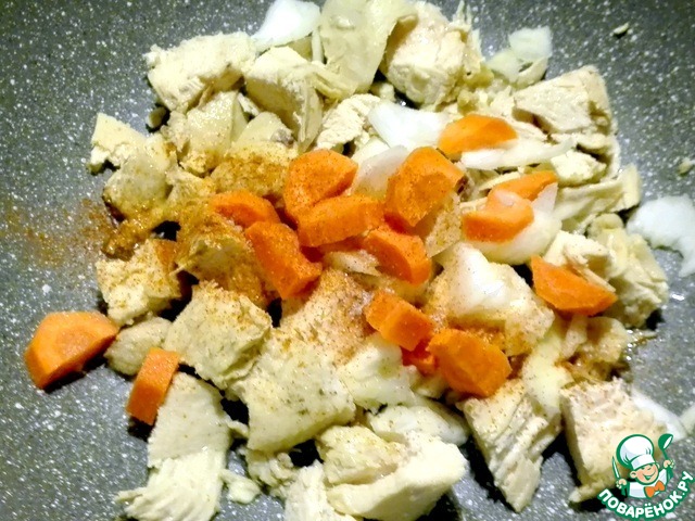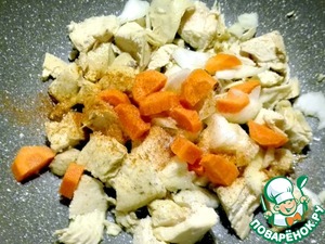 Нарезала кубиками куриное филе, морковь, лук и положила в разогретую