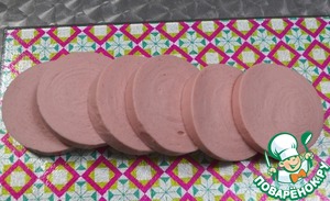 Сначала ставим разогреваться духовку на 200 градусов. Затем нарезаем колбасу на 6 кружочков.