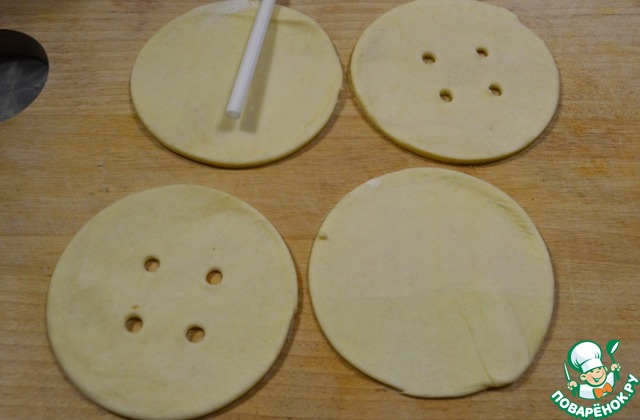 Для пуговиц нам понадобятся две формы: первая - чуть больше диаметра кружка колбасы, вторая - немного побольше первой. Большей формой нарезаем 12 кружочков теста. На шести делаем пуговичные дырки. Я использовала трубочку для коктейля.