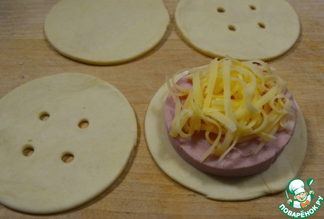 На цельный кружок теста кладём колбасу и щепотку сыра. Если хотите, можете посыпать перцем или другими специями.