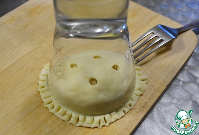 Накрываем дырявым кружком. Здесь хочу заострить ваше внимание. Если вы решили использовать тонкий кружок колбасы (например, взяли копчёную), то дырявый кружок теста можно оставить тем же диаметром. Я отрезала толстенькие кусочки колбасы, поэтому верхний кружок теста слегка подраскатала. Верхний кружок слегка придавливаем меньшей формой, вилкой скрепляем-украшаем краешки.