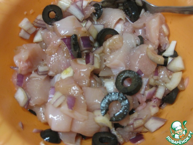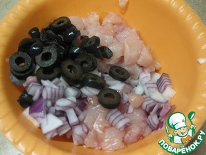 Сначала приготовим начинку, - для этого филе и лук нарежем не большим кубиком, оливки колечками