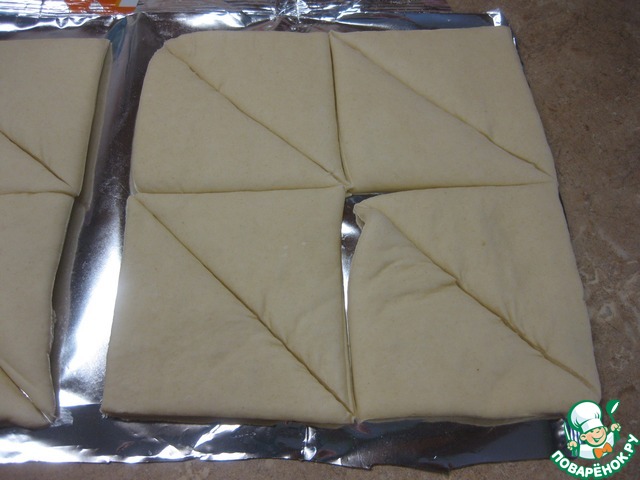 Теперь каждый пласт теста разрежем на 4 квадрата, а квадраты по диагонали, получатся треугольники