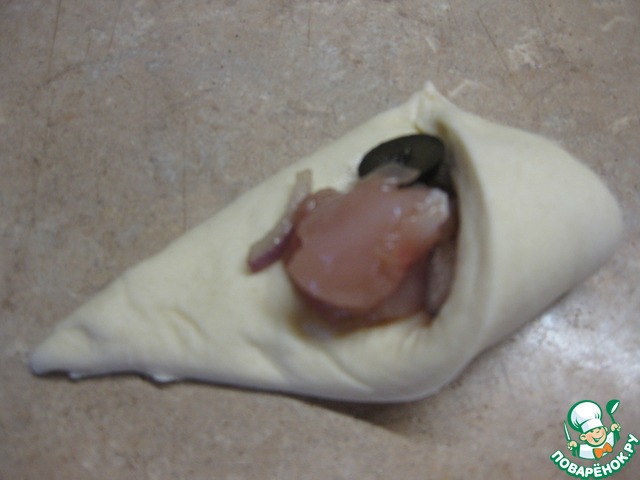 На серединку треугольника выкладываем немного начинки и заворачиваем длинные края к уголку, - сначала один (примерно так)