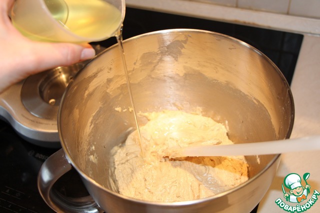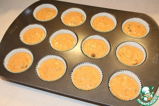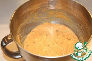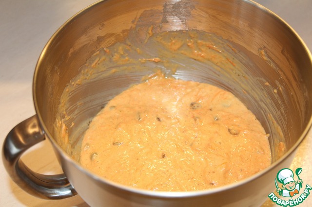 Добавить поочередно орехи, изюм, морковь, каждый раз вымешивая тесто.