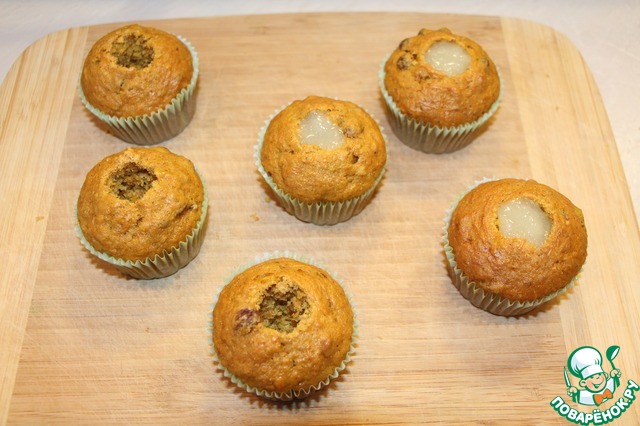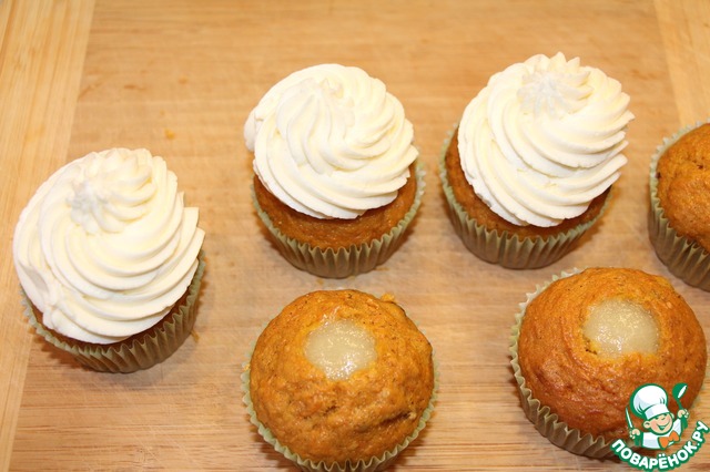 У капкейков аккуратно (при помощи маленького ножика или специального инструмента для вырезания теста) вырезать серединку и заполнить ананасовым пюре.