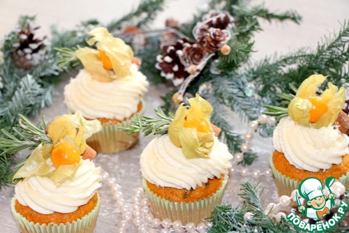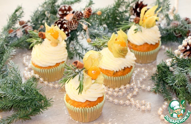 Украсить готовые капкейки по желанию и вкусовым предпочтениям. Я использовала физалис, палочки корицы и розмарин.