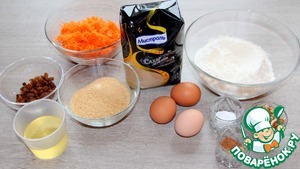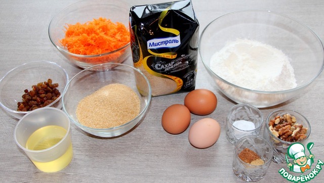 Для капкейков понадобится: мука, сахар тростниковый нерафинированный Демерара от Мистраль, разрыхлитель, соль, яйца, растительное масло, изюм, грецкие орехи, натертая морковь, смесь пряностей.