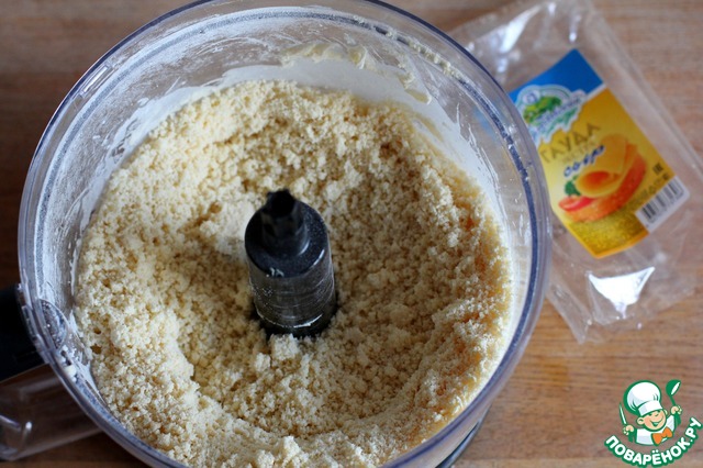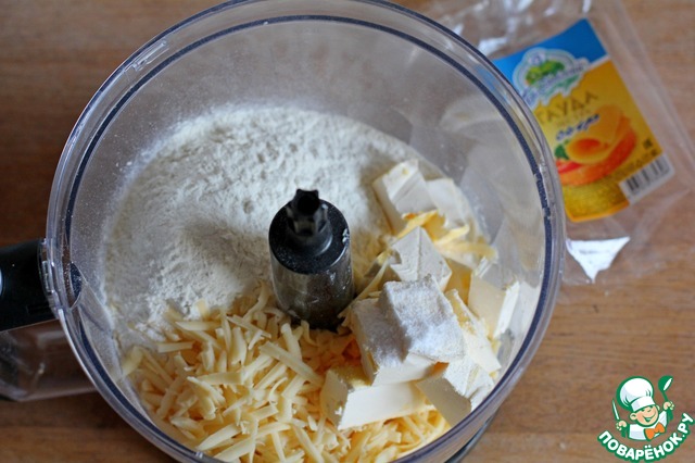 Теперь сложим в чашу комбайна или порубим ножом муку, соль, масло и сыр.